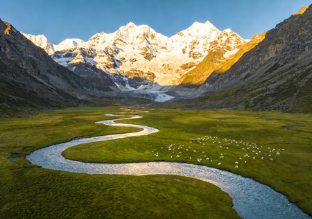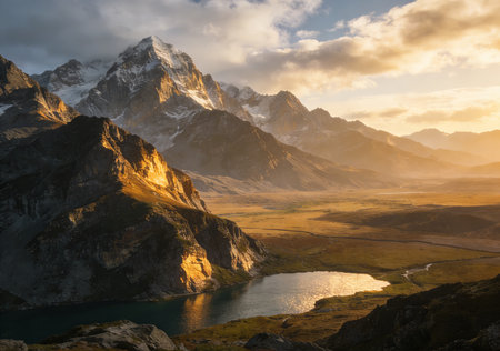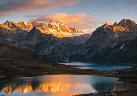 Sunrise paints the sky with vibrant colors as snow capped peaks rise majestically over a tranquil valley, creating a breathtaking natural view.