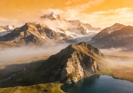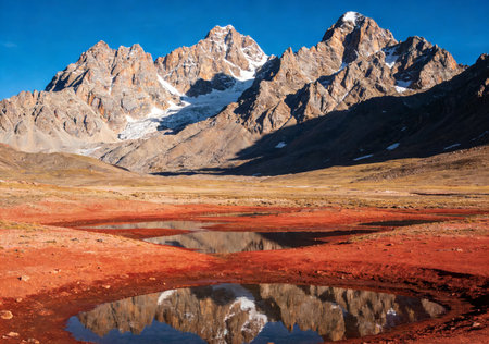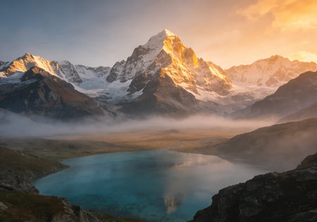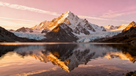 Stunning mountain landscape featuring towering glacial peaks and a serene lake. Captivating reflection in clear water, enhancing the natural beauty and tranquility.