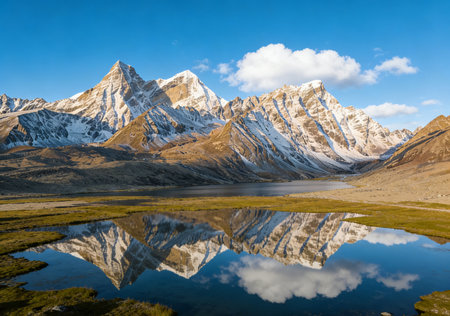 Majestic snow capped mountain peaks towering above a pristine glacial lake with the peaks perfectly reflected in the calm mirror like waters This breathtaking