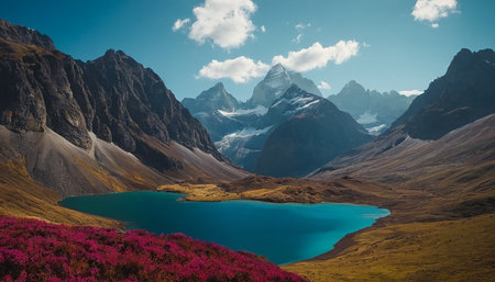 A vibrant turquoise lake is cradled within a rugged mountain valley. Steep, rocky slopes rise on either side, with patches of dry grass and scree. In the foreground, a carpet of bright pink flowers adds a splash of color. Snow-capped peaks dominate the background under a clear blue sky dotted with white clouds.
