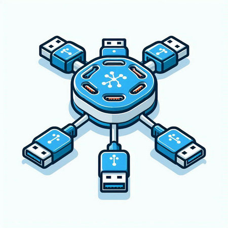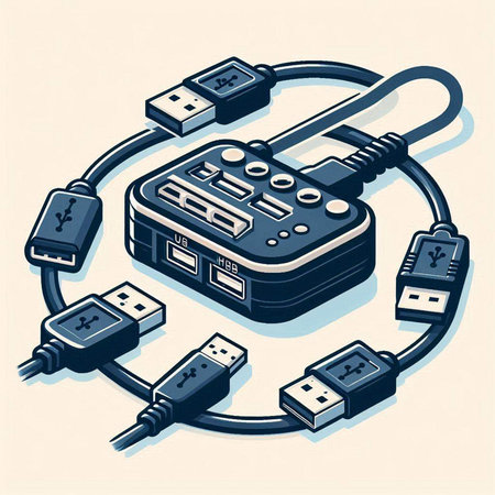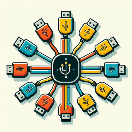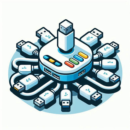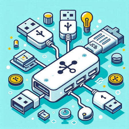 Isometric 3D illustration of USB cables connected to different devices.