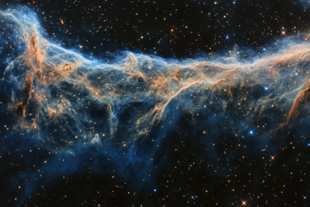 A cosmic cloud of gas and dust, illuminated by stars, glows in a vibrant orange and blue hue.