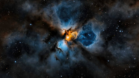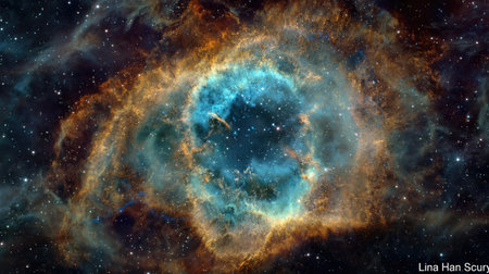 An ethereal nebula showcases cosmic dust and gas in radiant hues. The image features a bright central area surrounded by layered formations. The celestial event displays shades of blue, orange, and yellow against a backdrop of stars, ideal for astronomical publications and design projects.