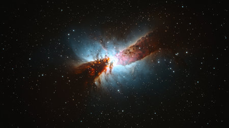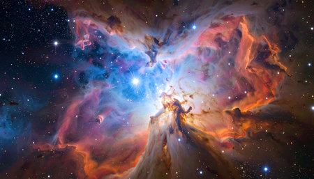 A vibrant nebula glows in the night sky with shades of blue, orange, and red, revealing cosmic beauty.