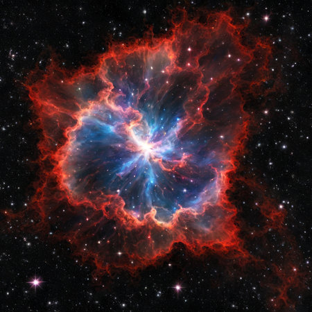 Vibrant red and orange nebula with scattered stars in the dark space.