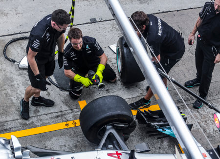 SEPANG, MALAYSIA - SEPTEMBER 28, 2017 : Team members of Mercedes British driver Lewis Hamilton practice a pit stop ahead of the Malaysia Formula One (F1) Grand Prix at Sepang International Circuit (SIC).
