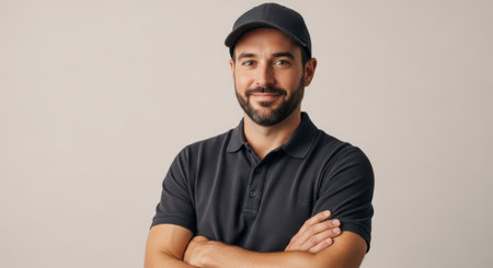 Confident young man in a dark polo shirt and baseball cap, standing with arms crossed. He has a neatly trimmed beard and a friendly smile, looking directly at the camera in a studio setting.