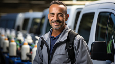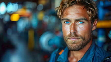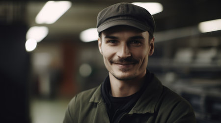 A smiling Swedish male factory worker standing in metal sheet factory. Generative AI AIG19.