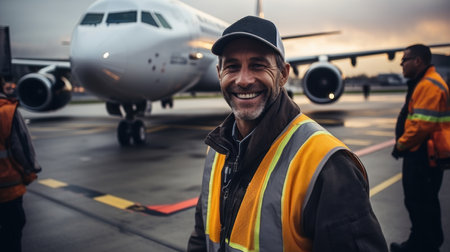 Confident male pilot in front of an airplane, epitomizing professionalism in aviation.