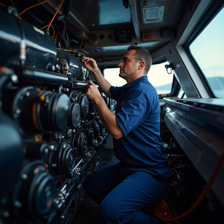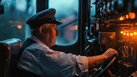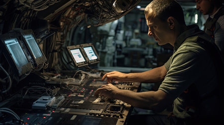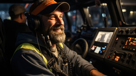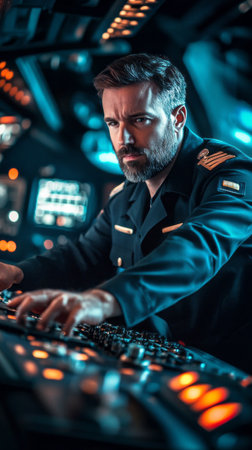 Dedicated and knowledgeable male cruise ship captain in the command room, checking the ship's controls with precision