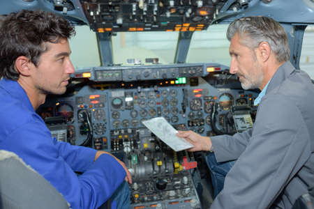 Male pilot pressing button on overhead panel in aircraft cockpit
