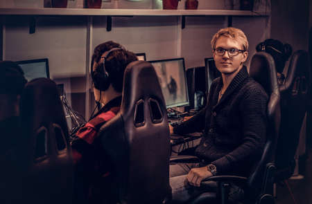 A young smart gamer wearing a sweater and glasses sitting on a gamer chair and looking at a camera in a gaming club or internet cafe.