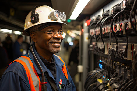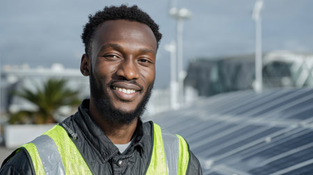 Professional African engineer in a reflective vest stands on a rooftop with solar panels, smiling proudly. The image captures the essence of renewable energy and eco-friendly innovation.