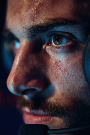Vertical close-up of a gamer intensely adjusting their headset, capturing a moment of concentration and preparation. The cinematic lighting enhances the focused expression.