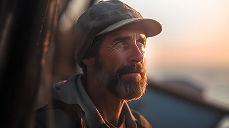 An elderly man with a kind smile, wearing a captains hat, enjoys a peaceful day on a boat as he gazes out at the sea under the warm sun.