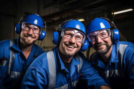 three maintenance engineer wearing blue uniform smiling bokeh style background