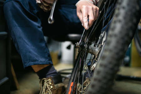 Bicycle mechanic fixing cycle wheel in repair shop. Velocipede service. Repairer male bike shop engineer fix bicycle wheel in workshop. Technician fixes bike parts. Handyman at work in the workplace.