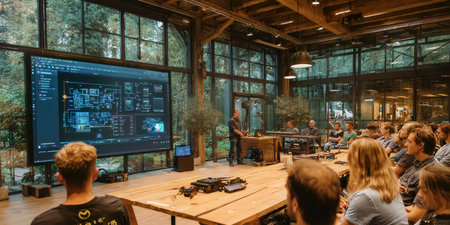 A speaker delivers a technical presentation to an engaged audience in a modern industrial workspace. A digital screen displays complex data, creating an immersive learning environment.