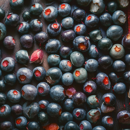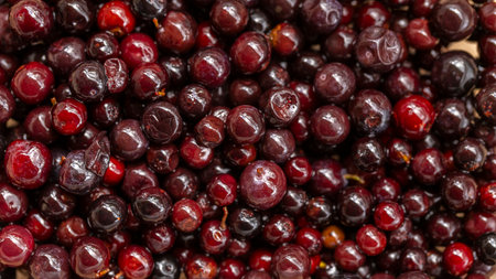 Background of Purple Amelanchier Lamarckii Fruits. View from Above