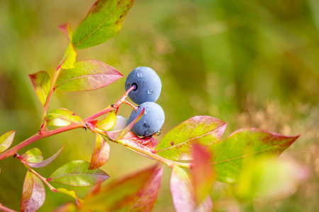 A beautiful sunny close-up of ripe blueberries growing in the bush with red leaves. A seasonal summer scenery in rural biological farm in Latvia, Europe.