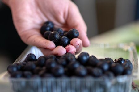 close up of a hand with red fingers holding a bunch of fresh picked huckleberries