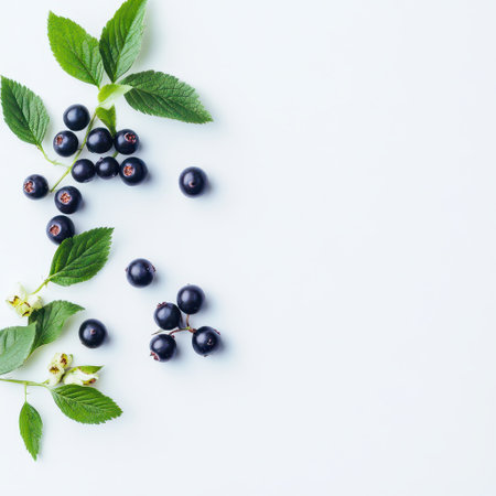 Blackcurrants with vibrant green leaves are artfully arranged on a clean surface showcasing their fresh appearance and natural beauty.