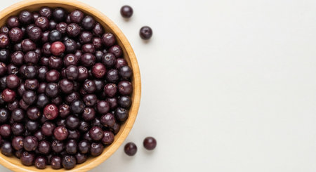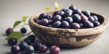 Bowl Full of Purple Amelanchier Lamarckii Fruits on Rustic Wooden Surface