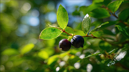 A captivating closeup view of vibrant wild blueberries delicately perched upon a slender branch, surrounded by an abundance of lush green leaves, set among a serene, rainy forest environment