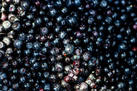 Blueberries covered by water drops. Macro photography of fresh blueberries. Ripe blueberries background. Blueberries texture. Food photography collection.