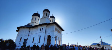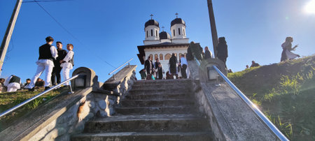SUCEVITA, ROMANIA - AUGUST 17, 2014: Sucevita painted fortified Monastery in Romania unique by exterior mural frescos of great artistic value depicting biblical episodes from the Old and New Testament, unesco heritage
