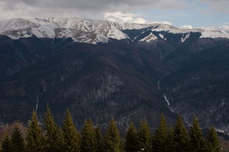 Alpine forest of the Carpathian mountains among the clouds and the mist of a rainy summer day. View from the DN7C, the Transfagarasan highway in Romania.