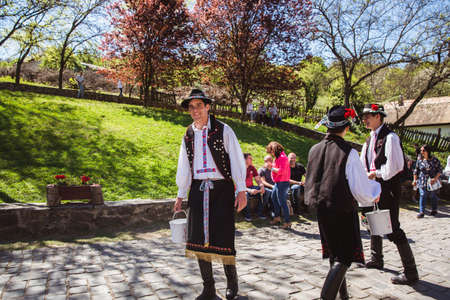HOLLOKO, HUNGARY - April 12, 2019: Easter festival in the folklore village of Holloko in Hungary. Guys sprinkle water on girls