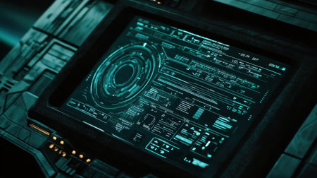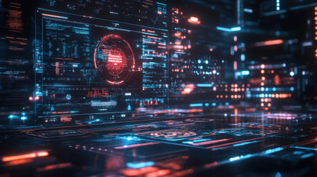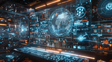 This striking image showcases a futuristic computer interface loaded with data and graphs, set in a high-tech control room environment. The vivid colors and intricate details highlight advanced technology and digital innovation, perfect for projects related to tech, data analysis, or futuristic concepts.
