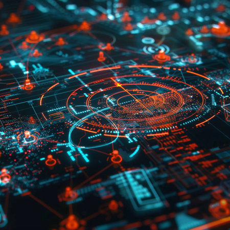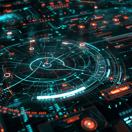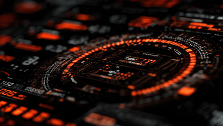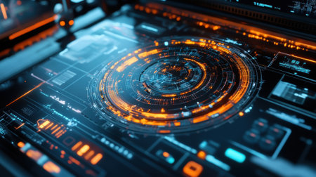 Digital interface with glowing orange circular HUD and data streams.
