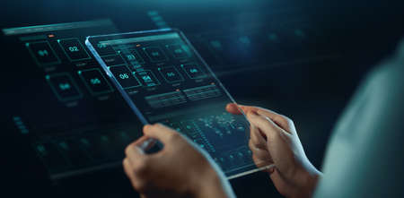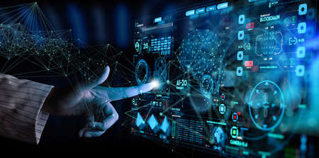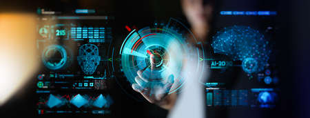 Woman hand in suit using hud interface with Artificial intelligence Machine learning Business Internet Technology concept.