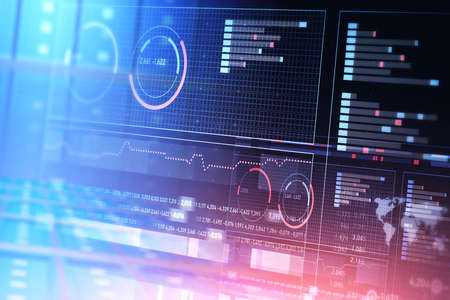 Business analytics and financial data concept with abstract digital trading terminal interface on dark blue background. 3D rendering