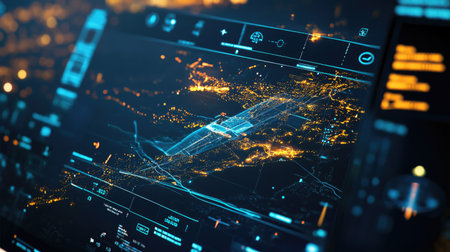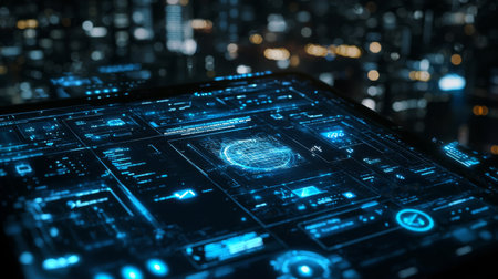 A high-tech digital interface showcased against a vibrant city skyline at night, featuring intricate data visualizations and advanced design elements for inspiration.