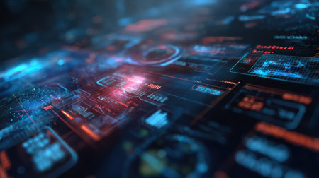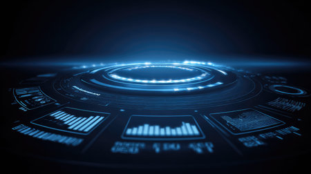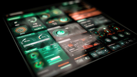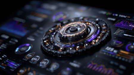 Explore a high-tech user interface featuring a digital dashboard with various metrics and analytics. Perfect for technology themes and futuristic concepts.