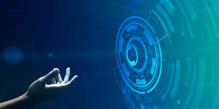 Development Concept. Side view of hand reaching out to virtual circles panel, banner, panorama, blue background