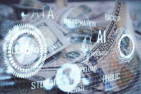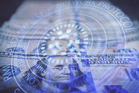 Double exposure of data theme drawing over us dollars bill background. Technology concept.