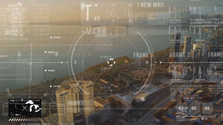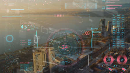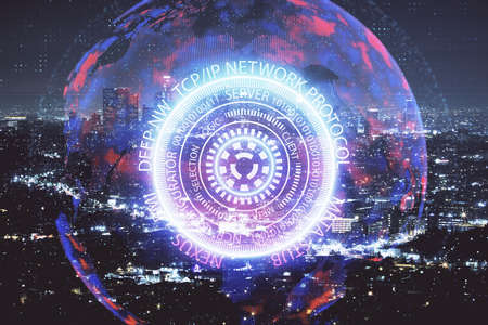 Double exposure of technology theme hologram and cityscape background. Concept of Hightech.