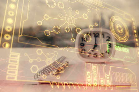 Multi exposure of technology theme drawing over table with phone. Top view. Concept of hightech.