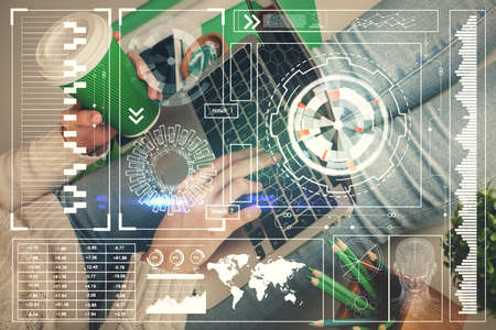 Double exposure of woman hands working on computer and data theme hologram drawing. Tech concept.