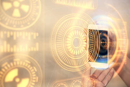 Double exposure of tech icon hologram and woman holding and using a mobile device. Technology concept.