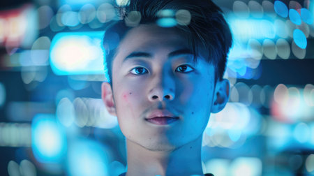 The picture of the young east asian male is working as e-commerce specialist in the office, the e-commerce job require skill like data analysis, marketing, customer service and time management. AIG43.