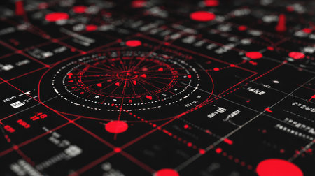 This abstract image features a detailed data visualization with red highlights on a dark background, perfect for use in technology and design projects focused on analysis.