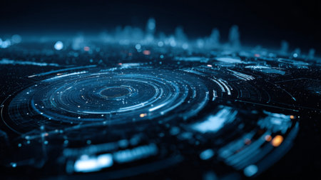 Explore a stunning futuristic digital landscape featuring circular data patterns and glowing connections against a distant cityscape backdrop at night.