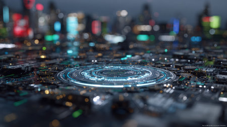 An artistic digital rendering presents a futuristic circular structure with glowing blue accents at the center. The composition reveals a low-angle perspective, emphasizing intricate circuitry against a blurred cityscape. This design, with its vivid colors and complex textures, may suit various creative projects and presentations.