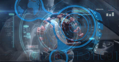 Image of statistics recording and scopes scanning on screens over grid. digital interface, global data processing and technology concept digitally generated image.