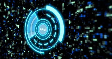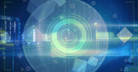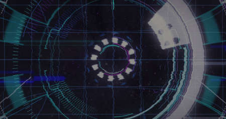 Digital image of light trails and glitch effect against round neon scanner on black background. technology background with texture and design